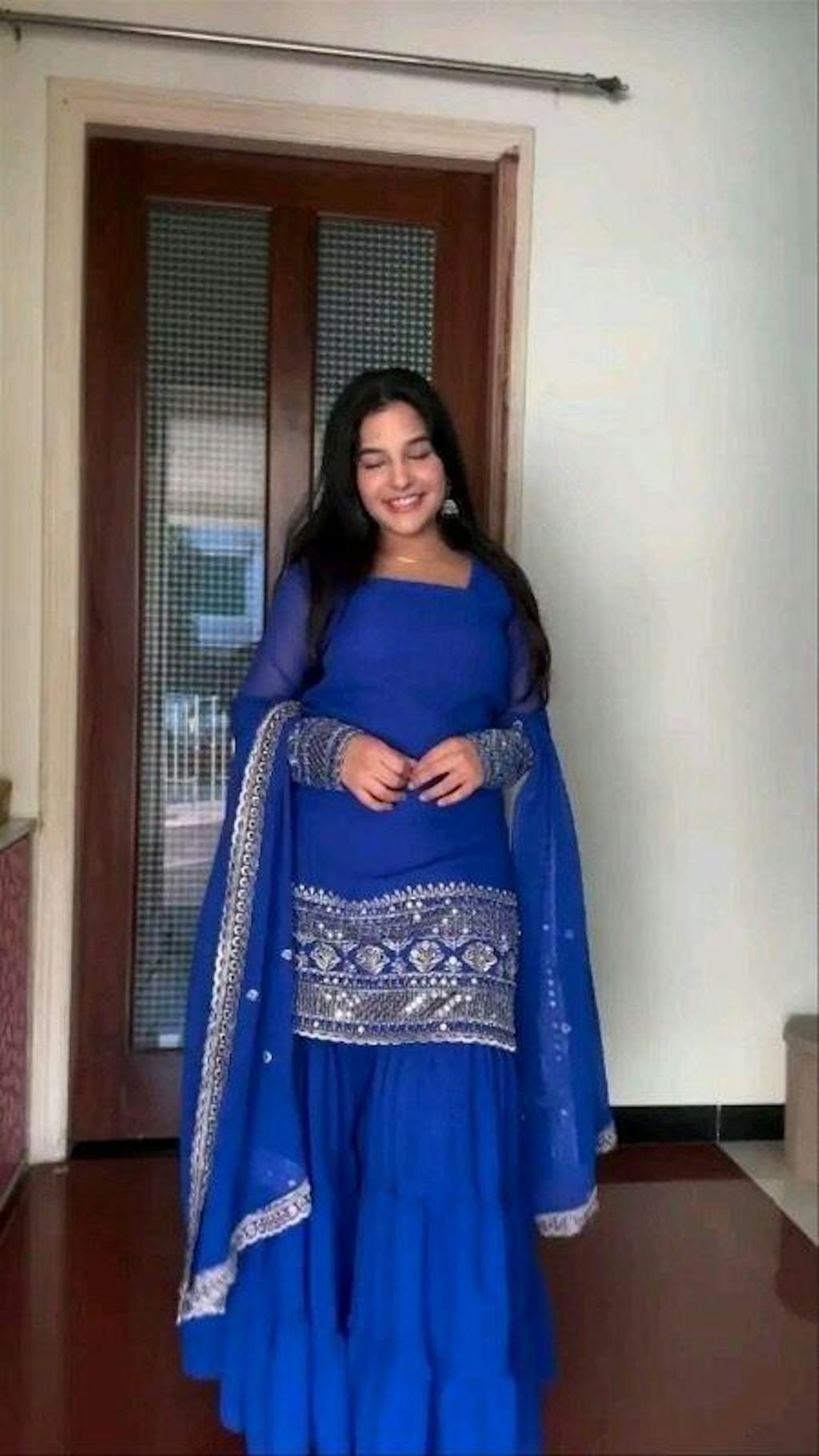 Step into elegance with this Royal Blue Mirror Work Sharara Suit, crafted for
